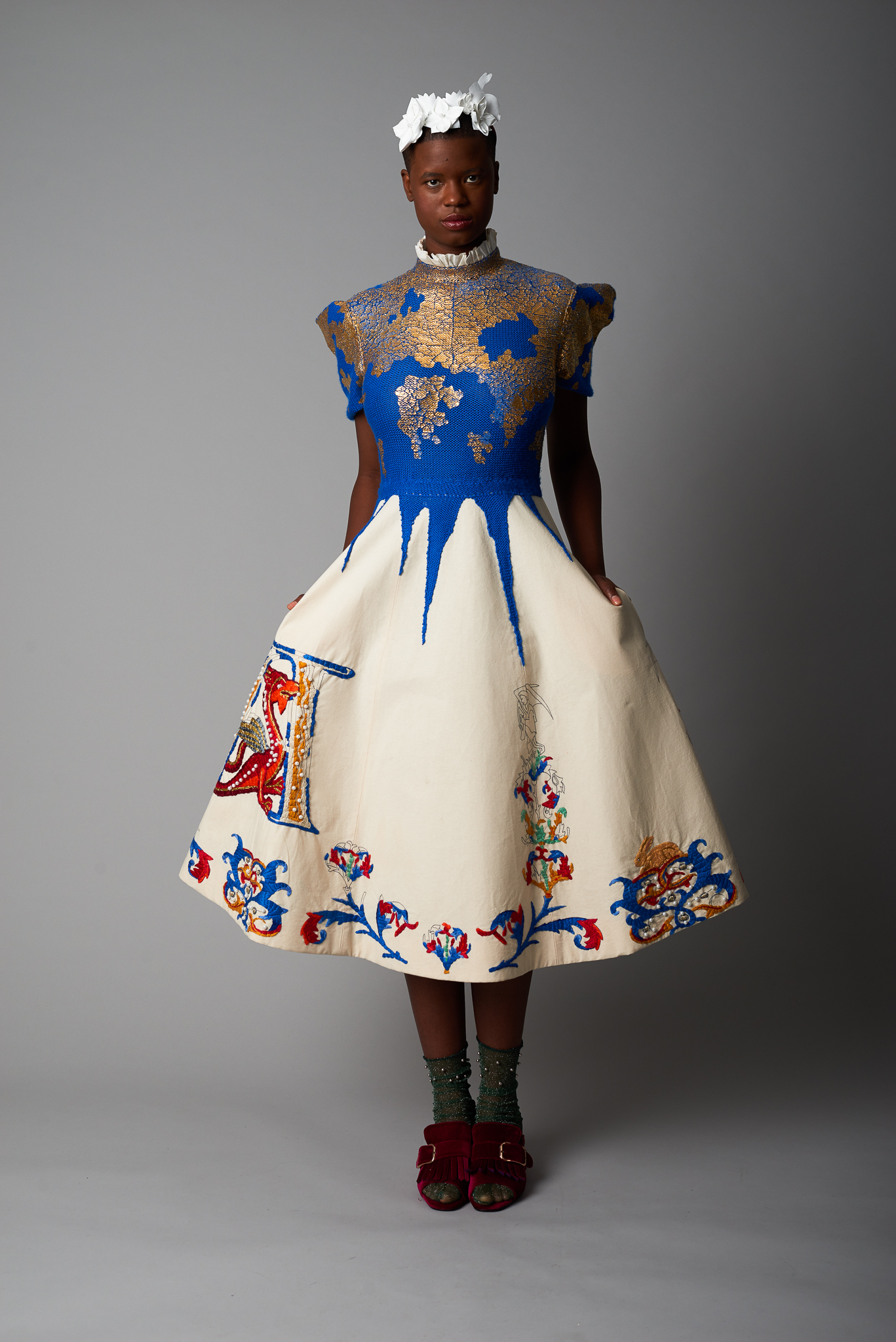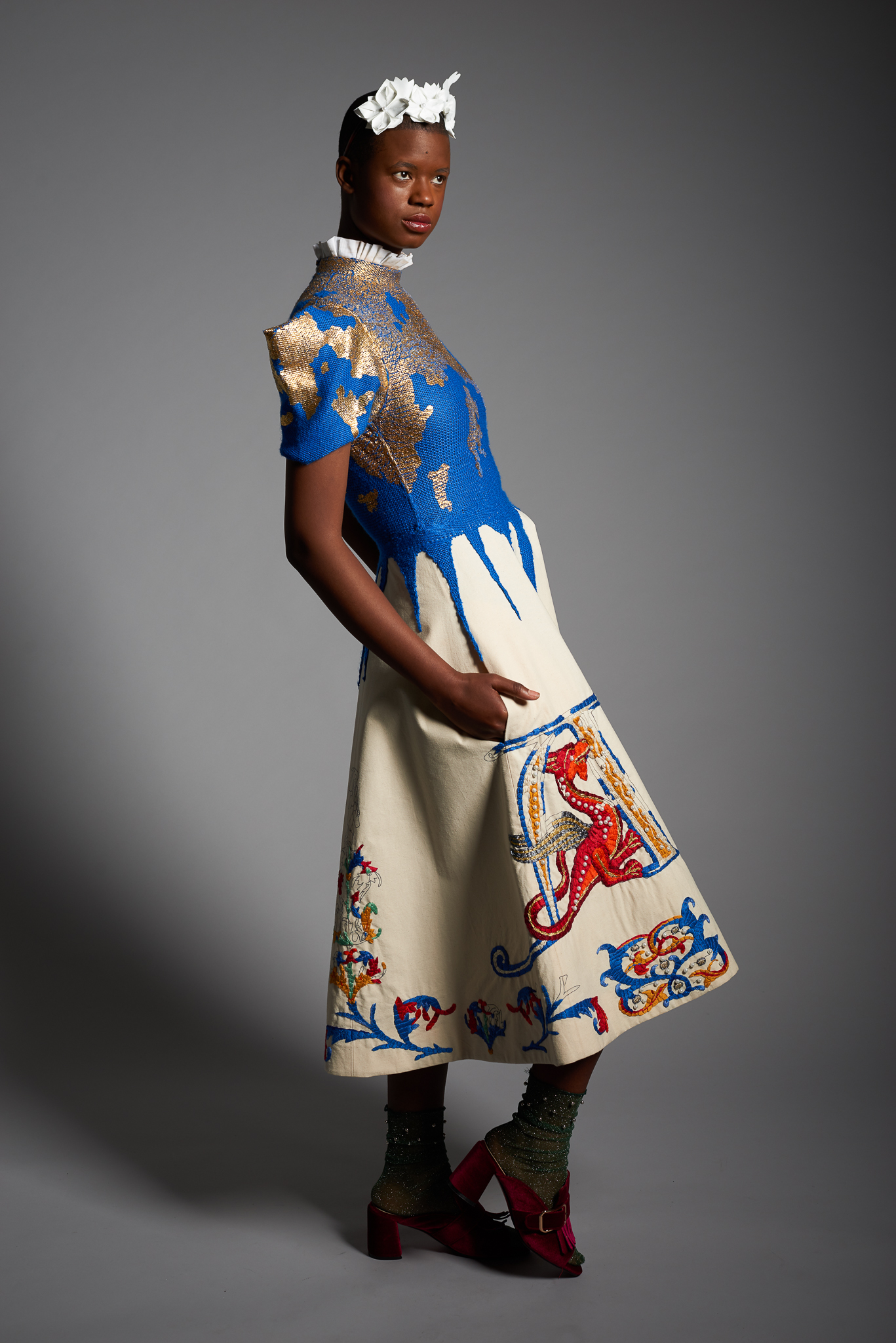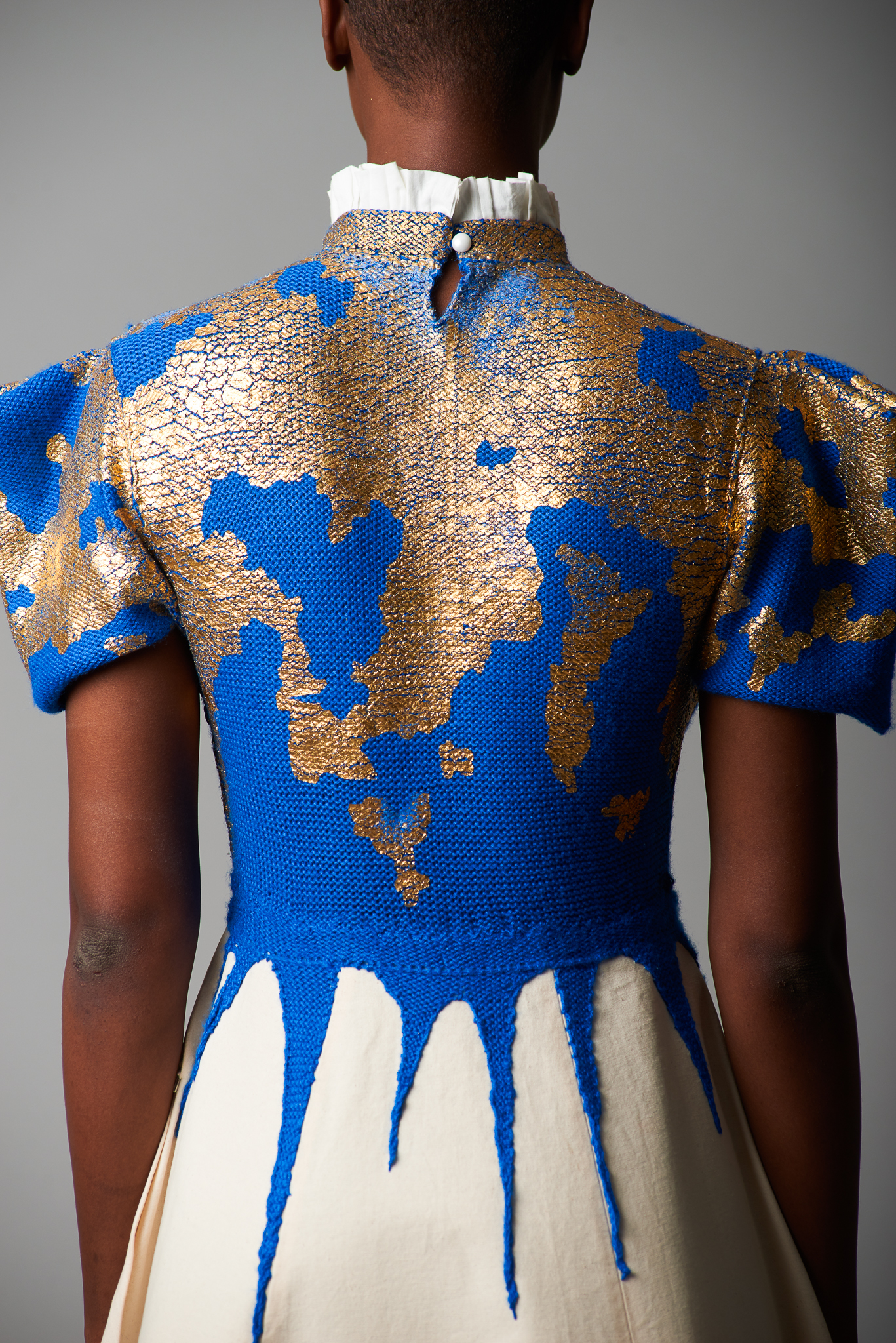 Materials: muslin, cotton, cotton yarn, gold leaf, cotton & lurex embroidery threads, gold leafs, pearl beads, tyvek