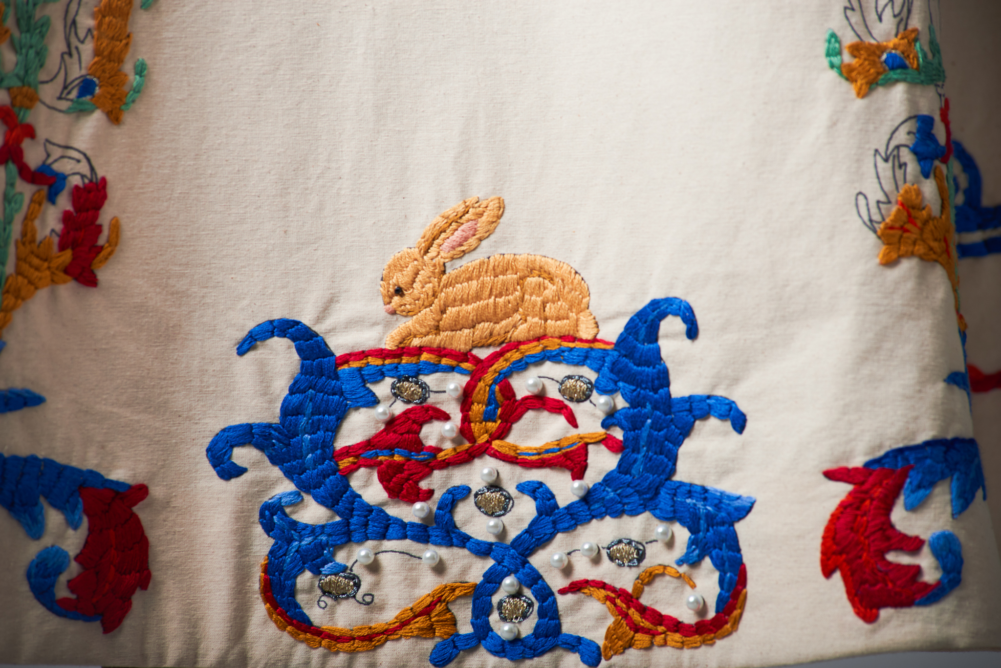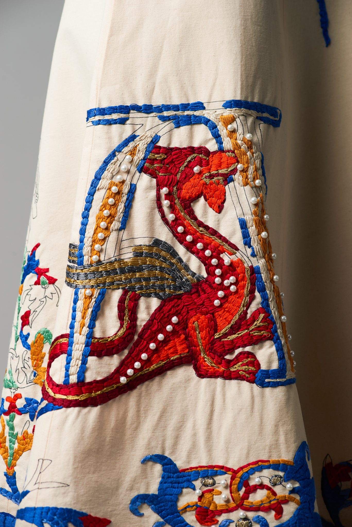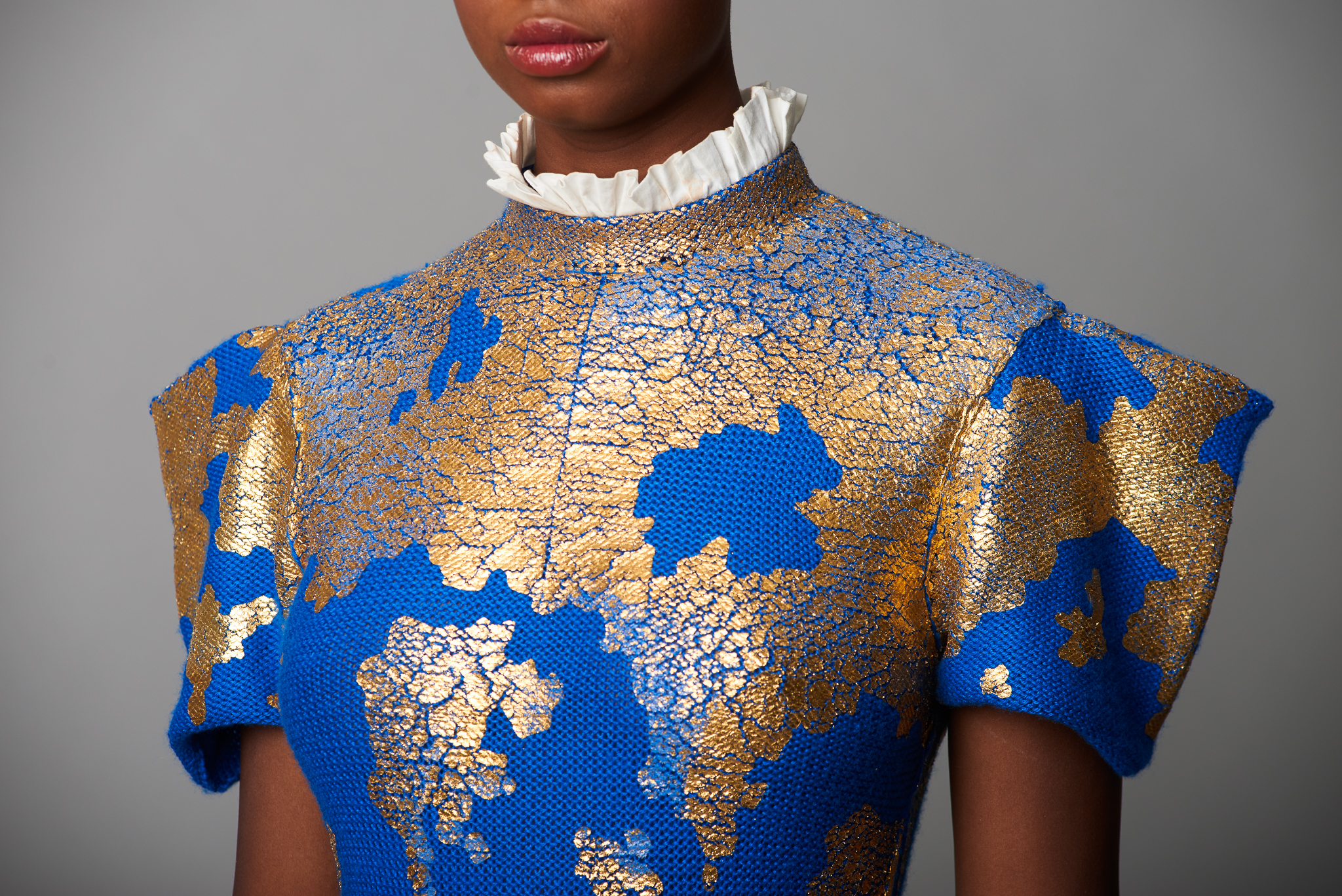 Materials: muslin, cotton, cotton yarn, gold leaf, cotton & lurex embroidery threads, gold leafs, pearl beads, tyvek