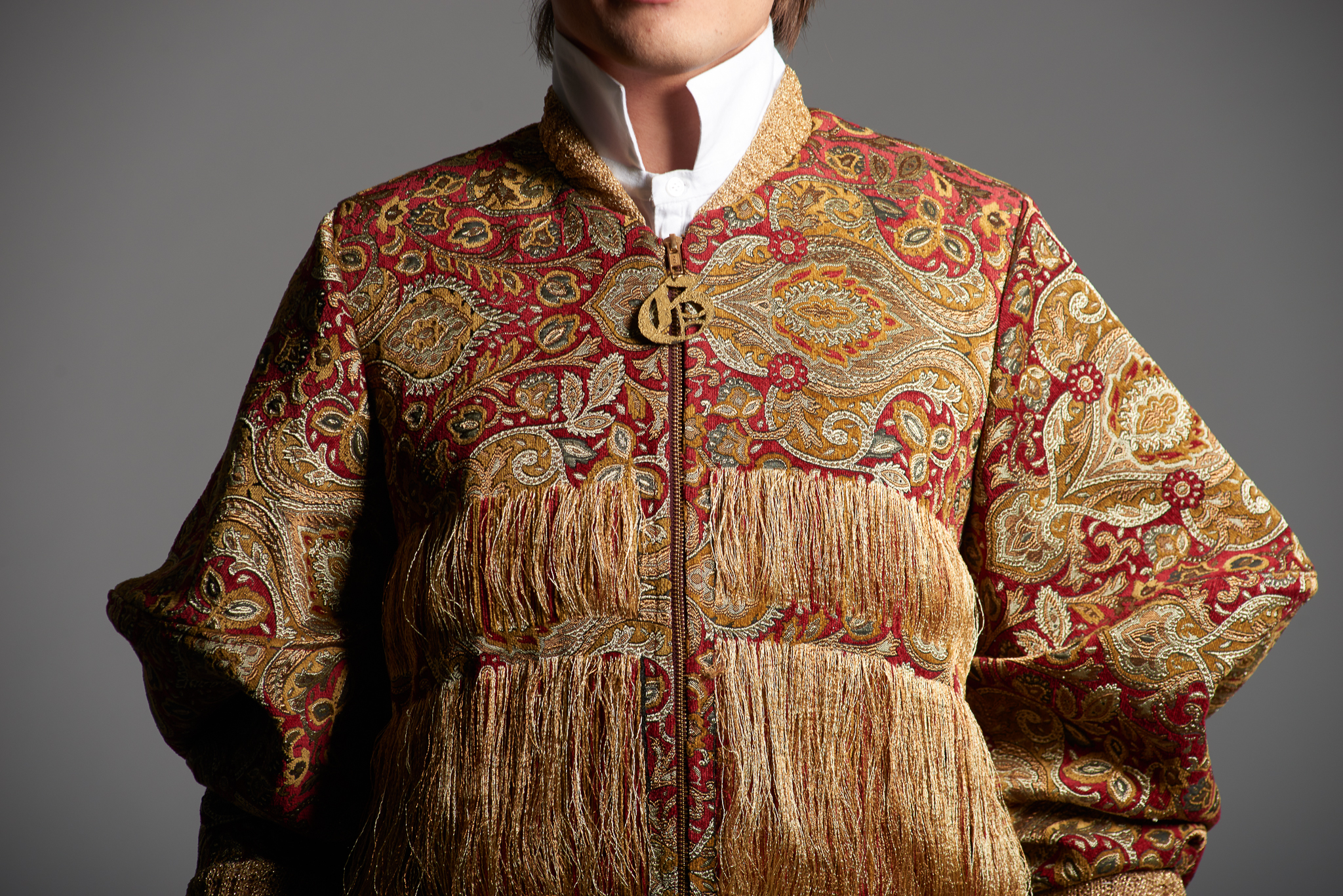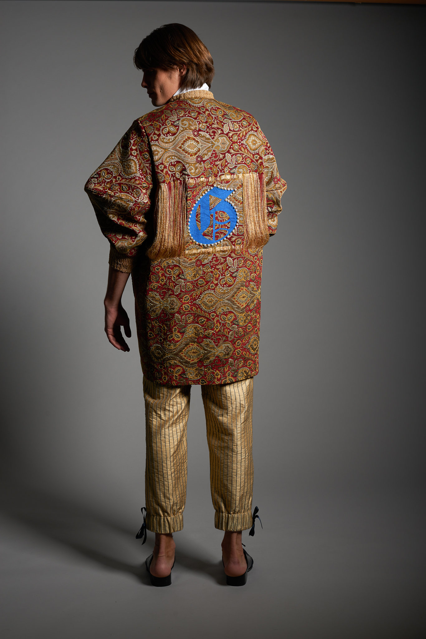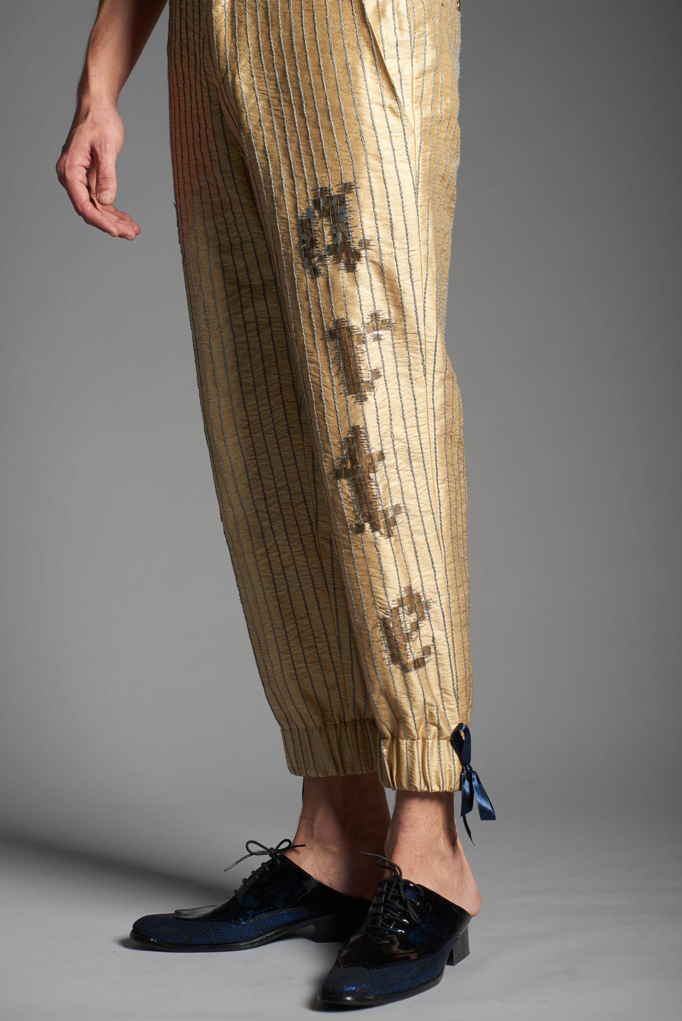 Materials: synthetic jacquard, cotton, pearl beads, raw silk, cotton embroidery thread, sequins, lurex yarn, plastic